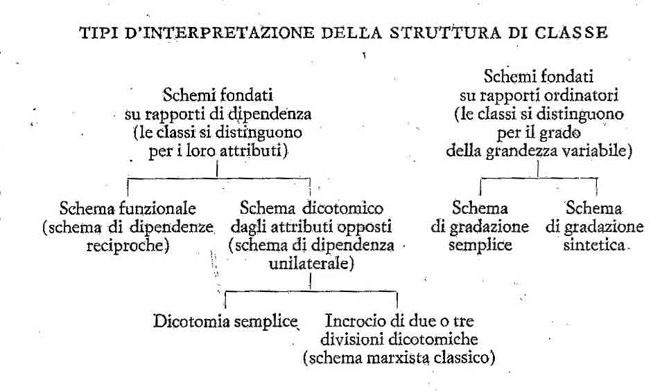 93- Marx come rivoluzionario, economista e sociologo, eredita quindi tutti e tre i tipi fondamentali di concezione della struttura di classe che incontriamo nella storia del pensiero europeo: lo schema dicotomico, lo schema di gradazione e lo schema funzionale. Contemporaneamente egli introduce un quarto modo di concepire questa struttura: mediante l’incrocio di due o tre divisioni dicotomiche. E’ appunto questo che è diventato per noi lo schema marxistico classico, sebbene non sia questo lo schema di cui si serve Marx nelle riflessioni sul concetto di classe intraprese nelle ultime pagine della sua opera principale.