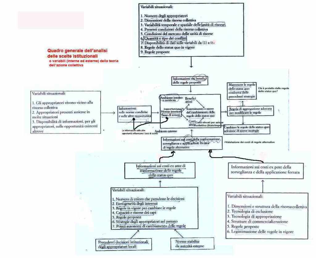 300- RAPPORTI DI MERCATO (= ambiente molto competitivo e più efficiente-> mercato aperto e rapporti statici –profitti-, senza cambiamenti tecnologici o istituzionali )vs RAPPORTI DI COMUNITA’ (ambiente meno efficiente con situazioni legate all’uso di risorse collettive) /314- NORME IDEATE VS NORME EVOLUTE-> Preconcetto quasi universale che spinge a sovrastimare i benefici e sottostimare i costi in contesti su larga scala del terzo mondo / 301- SCELTE ISTITUZIONALI 1. Come processi meccanici di calcolo e 2. Come processi di valutazione di costi e benefici (con i preconcetti implicati-> per es. gli individui attribuiscono maggior peso alle perdite potenziali rispetto ai guadagni potenziali) / 302- Risorse che si distruggono rapidamente vs risorse che si rivelano più elastiche dopo un deterioramento-> Chiari indicatori di degrado della risorsa = presagio di danno futuro / 303– E’ molto improbabile che gli appropriatori di risorse collettive sostengano costi di trasformazione immediati per cambiare le loro regole, se si prevede che i benefici netti scontati di un cambiamento netto delle regole non saranno grandi /Ci sono difficoltà a fare stime sulla frequenza, dato che gli eventi vicini appaiono dotati di maggior peso /303- Data la sostanziale incertezza associata a qualsiasi situazione di cambiamento di regole, è meno probabile che gli individui adottino regole non familiari, piuttosto che regole adottate da altri in circostanze simili e che hanno funzionato relativamente bene /305- Date le tentazioni di evadere, di sfruttare gratuitamente e in genere di agire opportunisticamente (…) [per i problemi di risorse collettive] il superamento di tali problemi non potrà mai essere dato per scontato / Il detto “se non è rotto, non occorre ripararlo” si applica altrettanto bene al capitale istituzionale che al capitale fisico /306- Basso tasso di sconto = valutazione molto positiva dell’attività di prosecuzione dell’utilizzo di una risorsa collettiva /310- [COMPLESSO INSIEME DI VARIABILI vs UNICO MODELLO]-> per quando gli individui cercano di forgiare regole per migliorare i risultati individuali e collettivi / famiglia di modelli vs modelli specifici-> Se le scienze sociali devono avere un ruolo effettivo nell’analisi di problemi politici / Ciascuna risorsa collettiva come nicchia in un terreno empirico / PRO COMPRENSIONE DI SISTEMI DINAMICI COMPLESSI / 311- Nelle concezioni contemporanee dell’ “ordine sociale”, il “governo” viene spesso visto come agente esterno il cui comportamento è esogeno rispetto alla situazione che viene modellata [vs individui incapaci di risolvere i problemi collettivi tra loro] / 313- Autori alla base della moderna teoria politica: Hobbes, Montesquieu, Hume, Smith, Madison, Hamilton, Tocqueville.